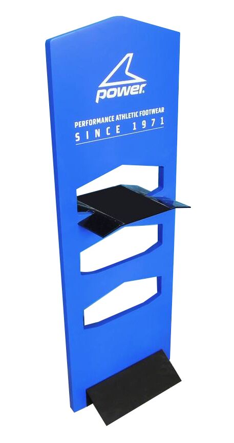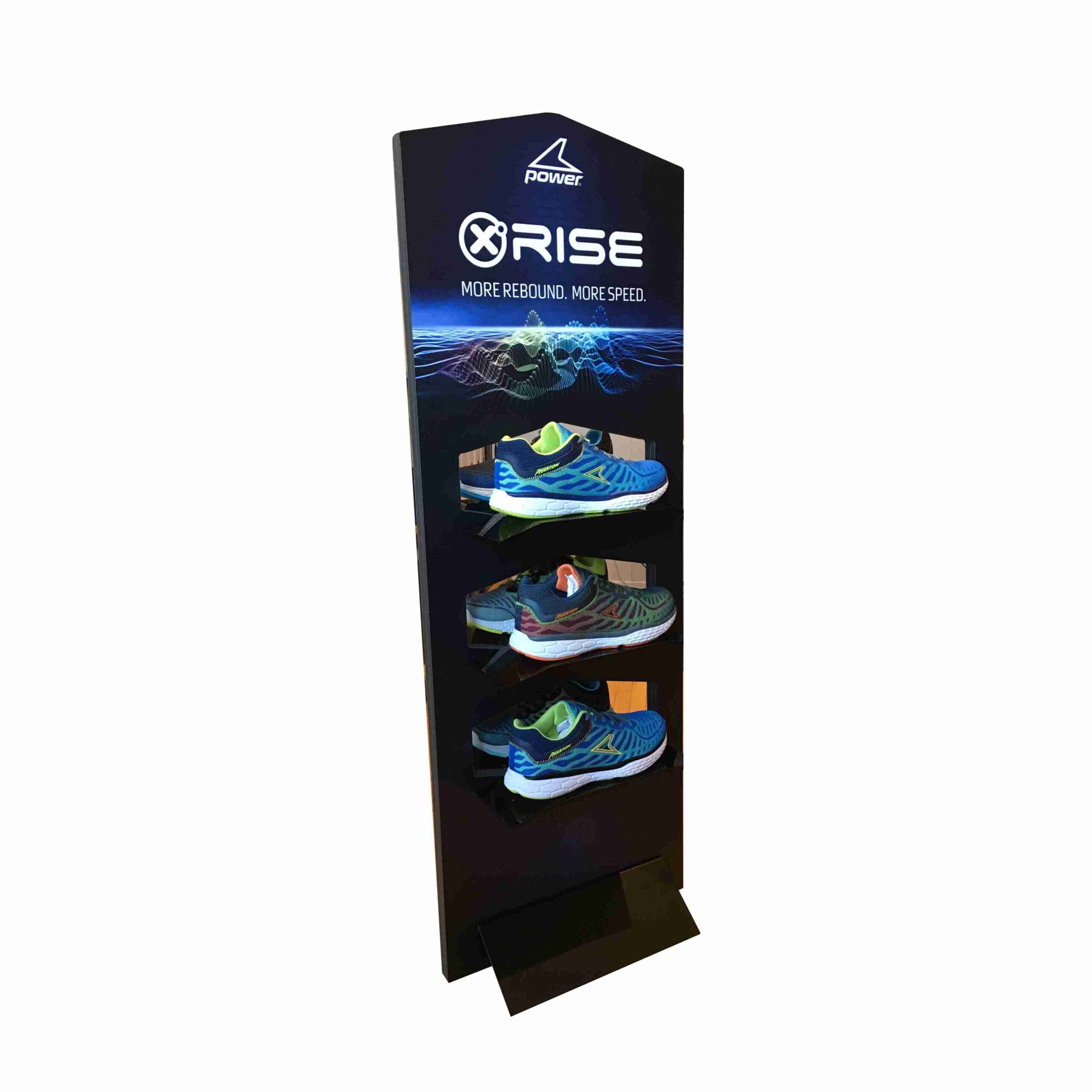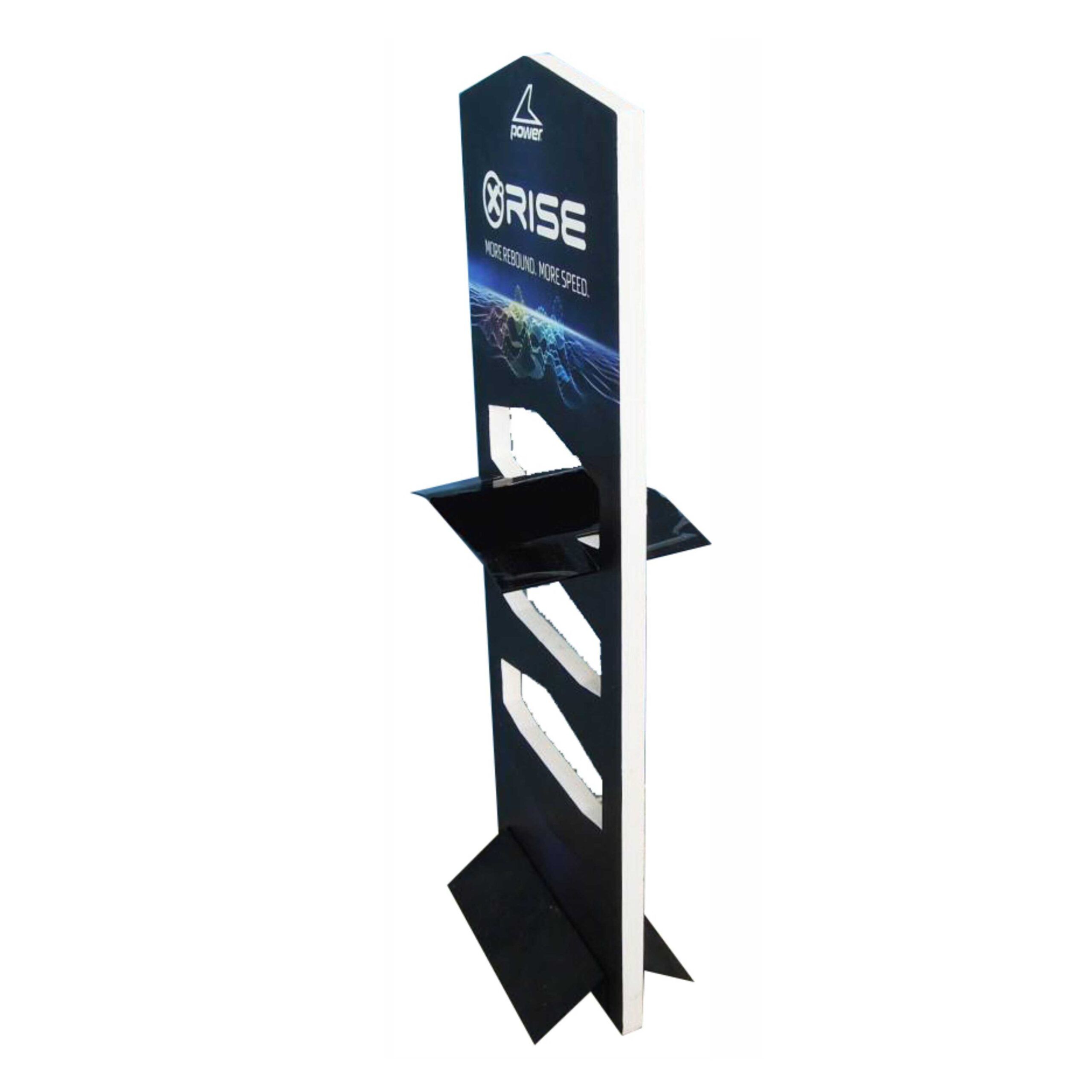The floor display rack has 3 layers, with two sides and both display advertising pictures. the bottom is supported by iron pieces to maintain balance.